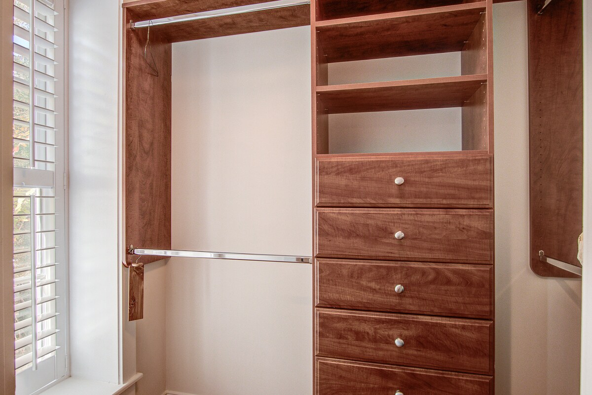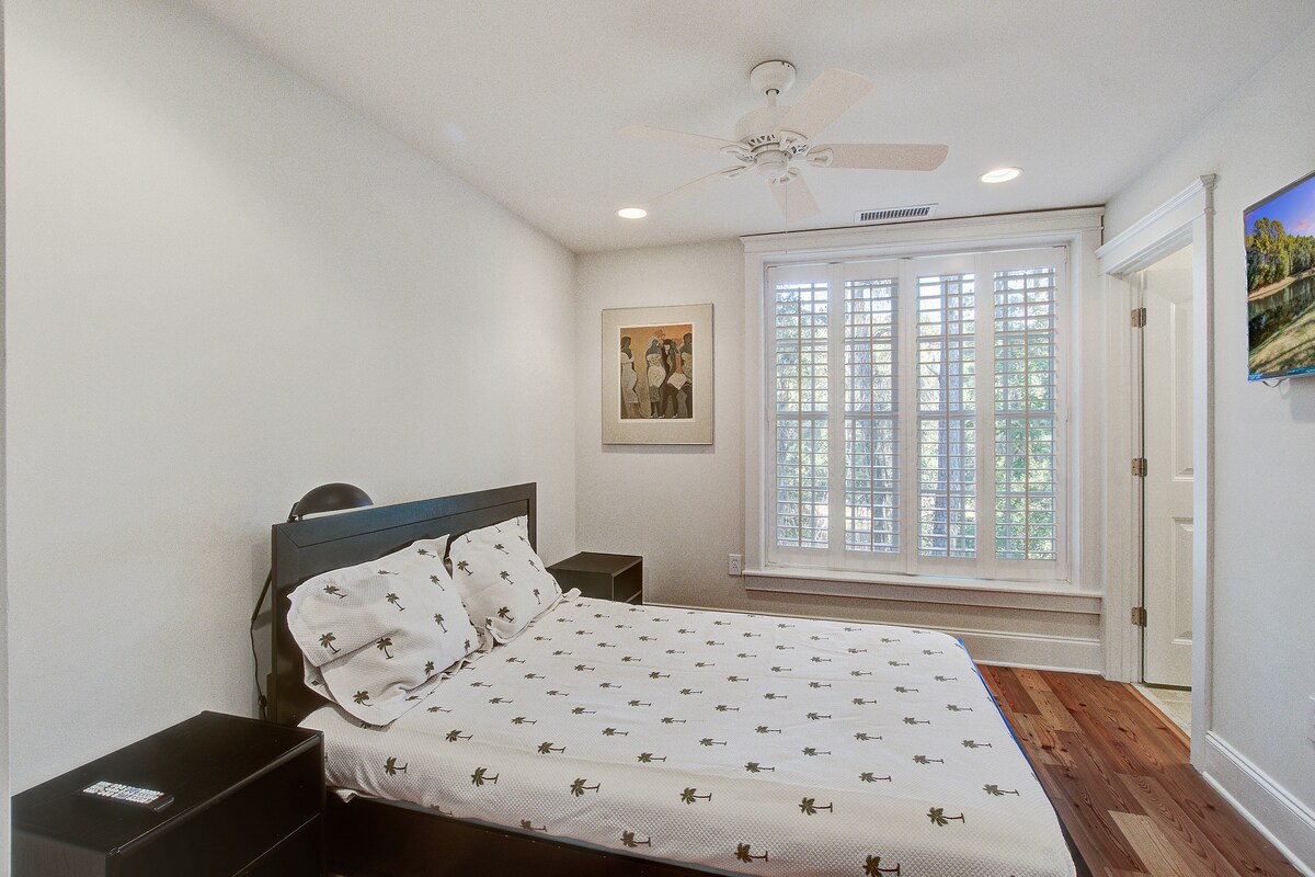 Both bedrooms are designed for restful stays, each offering high-quality bedding, ample closet storage, ceiling fans, and large windows with plantation shutters. The layout provides privacy for dual occupants or visiting family.